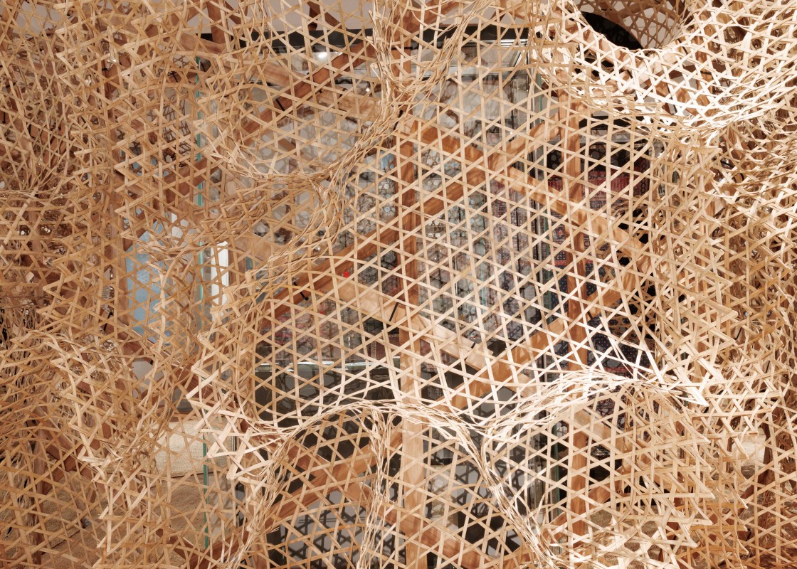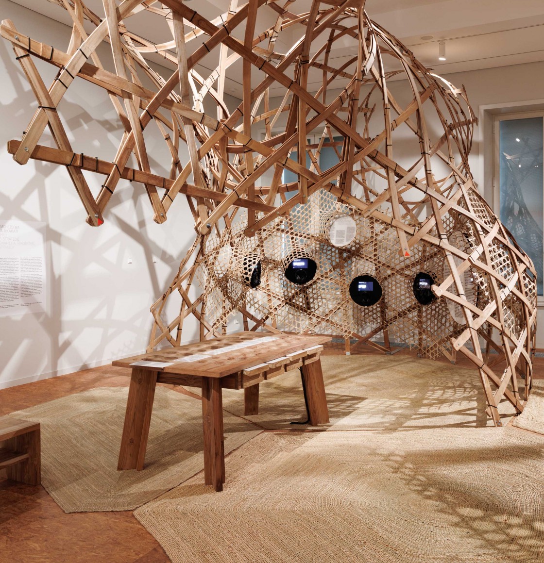 The central spatial element is a woven structure made of teak and bamboo, based on local craft techniques. It structures the exhibition space, protects sensitive content, and at the same time enables a sensory and spatially experiential approach to the exhibited content. The structure was manufactured in Tanzania and assembled in Berlin by Tanzanian craftsmen.