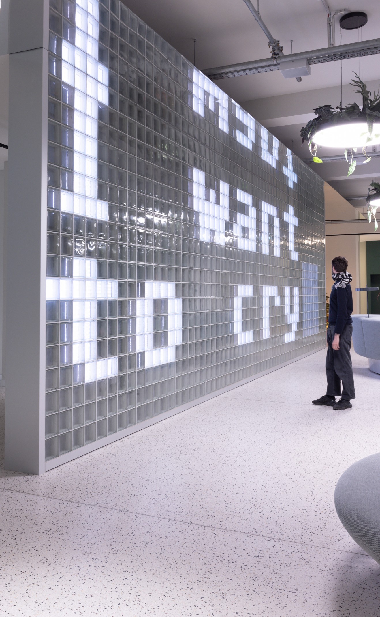 Poetic Pixels is a subtle counter-voice in the lobby of Schicklerhaus in Berlin. An LED surface shimmers behind a wall of glass bricks. Each brick becomes a pixel, each pixel a point of light. The pixels form language, shaped by generative text systems that unfold in continuous variation.